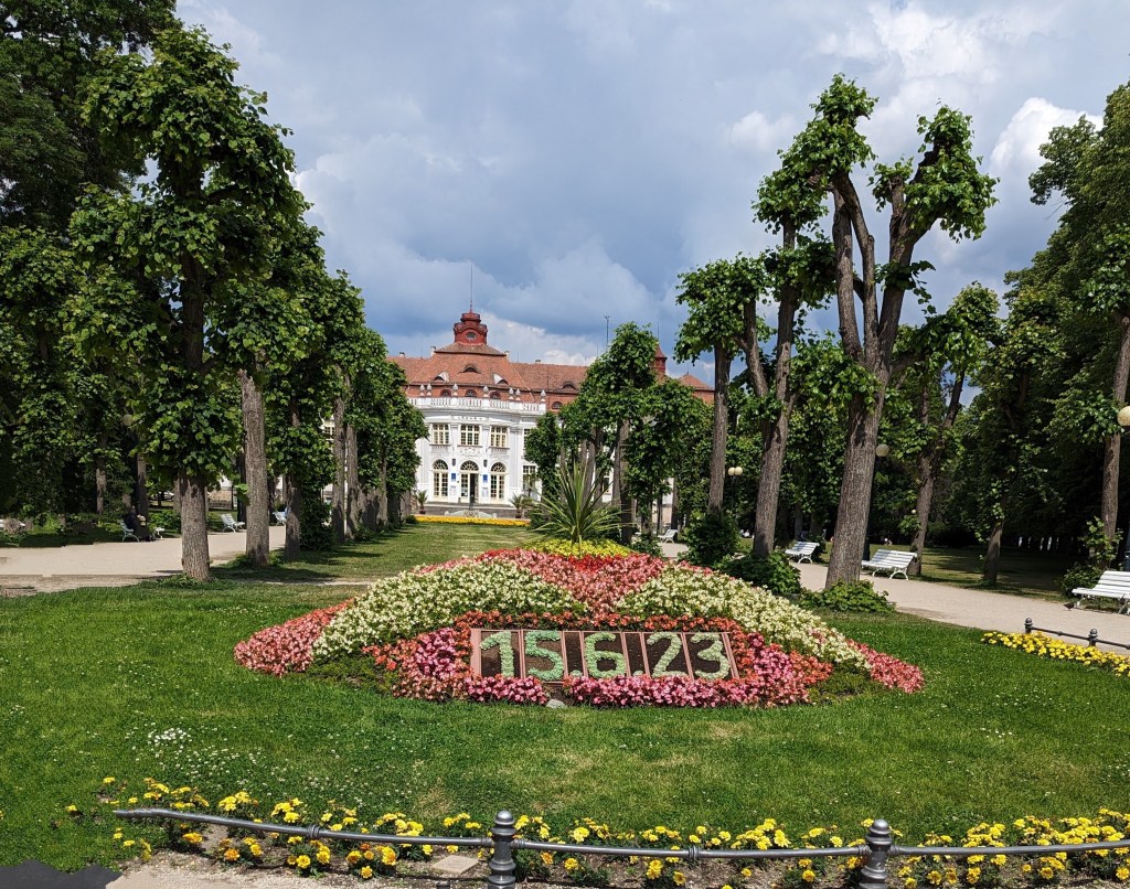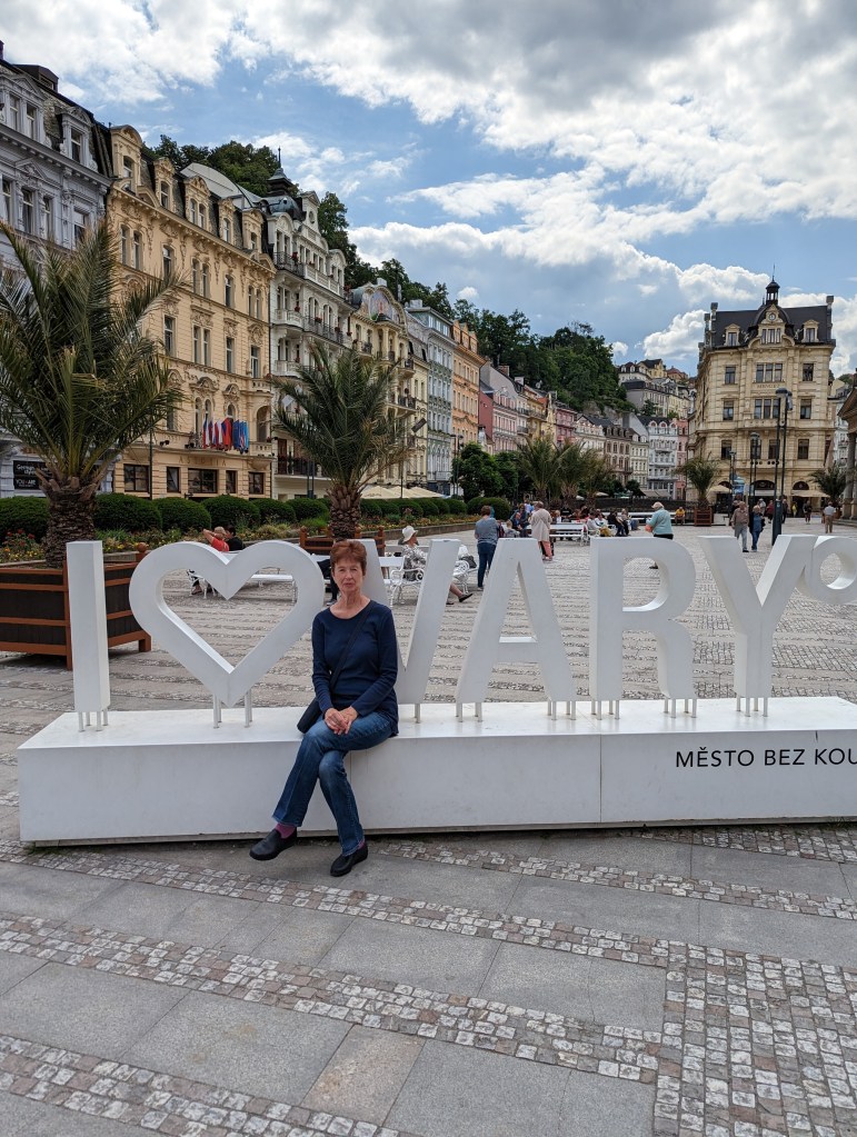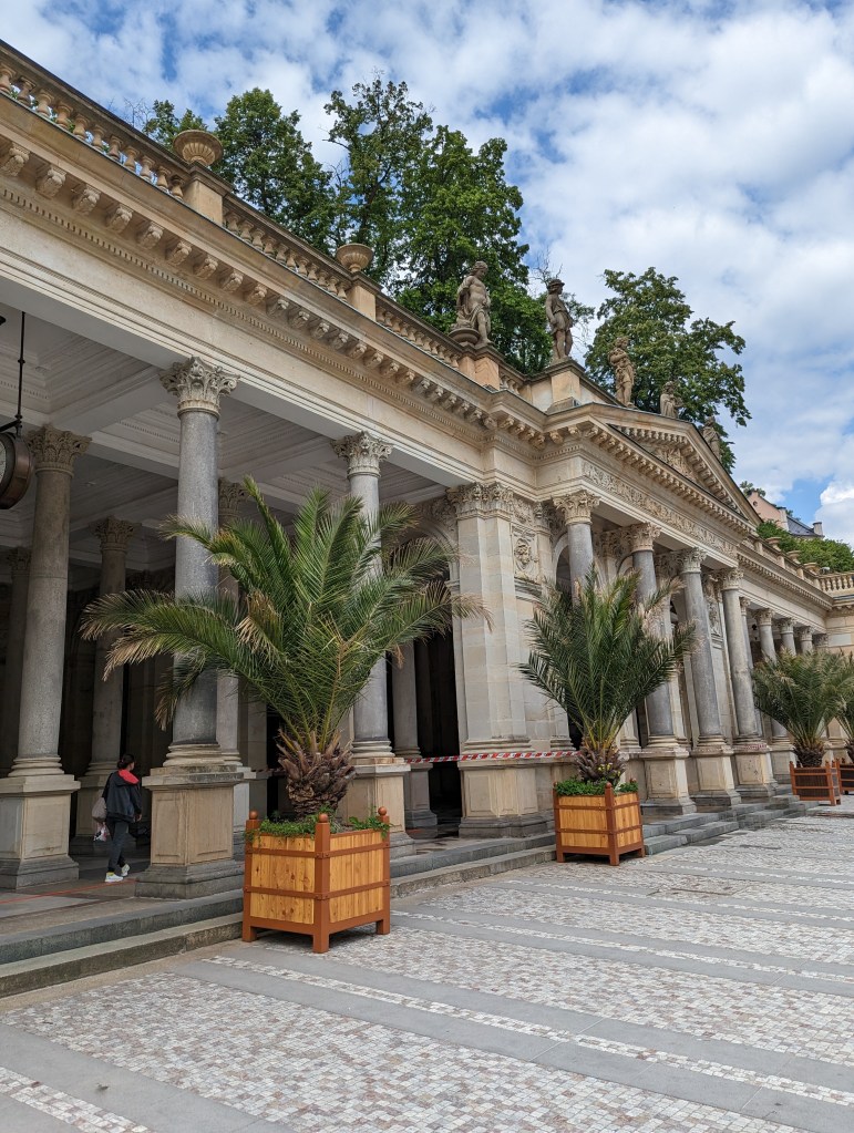 Karlovy Vary (Czech for Carlsbad) is the sister city to Carlsbad, California. Our Hotel Romance was on the side of a hill – lots of those just getting to our hotel. Its a pretty little town. In our travels, we learned that this is a famous spa town. Inside the Mill Colonnade (see below) are several hot springs.